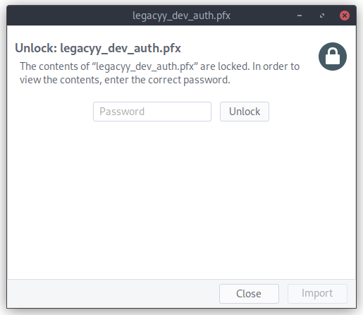 The Dev folder contained the winrm_backup.zip file which contained a pfx certificate (legacyy_dev_auth.pfx). Unluckily for us, it's password protected, so I tried to crack it. First I used zip2john to get the hash for the zip file, and then I run it through hashcat:
